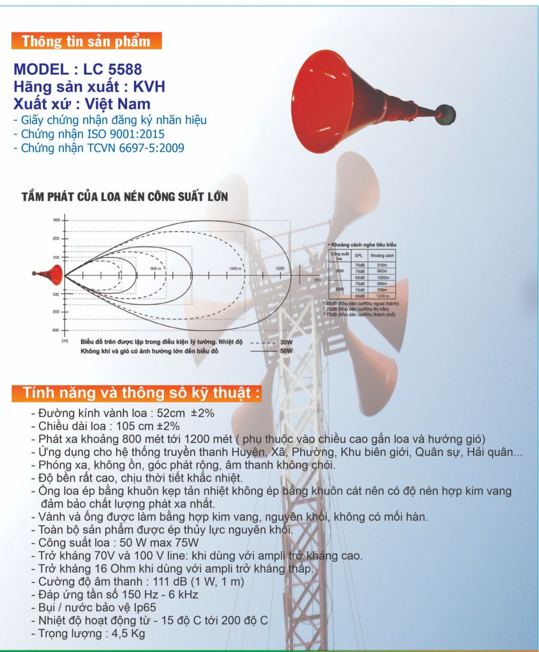 Loa còi phát thanh 50w LC-5588 là loại loa chuyên dụng trong phát thanh thông tin làng xã. Mục đích làm âm thanh thông báo cho nhân dân nghe các bản tin.